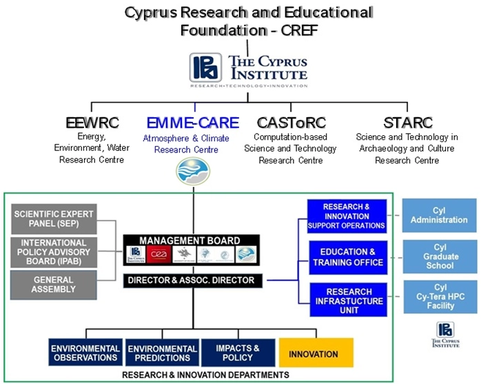 The CARE-C Centre of Excellence (CoE), stemming from the EMME-CARE project, (H2020 GA no.856612), is embedded into the legal structure of the Cyprus Institute (CyI), but has full autonomy both in its executive decisions and in defining its Research and Innovation agenda. This autonomy is already in place in all of CyI’s Research Centers and has shown to be a key driver for their rapid development and competitiveness.