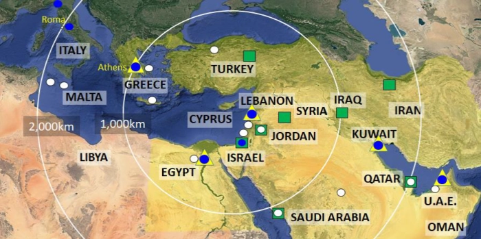 White circles: 1,000 and 2,000km distance from Cyprus