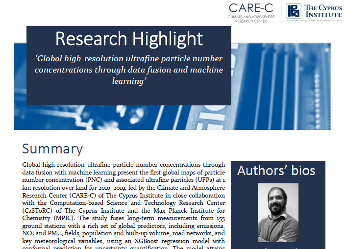 Global high-resolution ultrafine particle number concentrations through data fusion with machine learning presents the first global maps of particle number concentration (PNC) and associated ultrafine particles (UFPs) at 1 km resolution over land for 2010–2019, led by the Climate and Atmosphere Research Center (CARE-C) of The Cyprus Institute in close collaboration with the Computation-based Science and Technology Research Center (CaSToRC) of The Cyprus Institute and the Max Planck Institute for Chemistry (MPIC). The study fuses long-term measurements from 155 ground stations with a rich set of global predictors, including emissions, NO₂ and PM₂.₅ fields, population and built-up volume, road networks, and key meteorological variables, using an XGBoost regression model with conformal prediction for uncertainty quantification. The model attains R2≈0.90 on an independent test set and R2 of 0.77–0.87 under spatial and temporal cross‑validation, and indicates that UFPs constitute on average about 91% of total PNC, with annual mean near-surface PNC ranging from a few thousand cm⁻³ in pristine regions to over 40,000 cm⁻³ in polluted urban centres. The resulting open-access NetCDF dataset (2010–2019) provides annual mean PNC, UFP and 95% coverage intervals on a global 1 km grid, enabling direct integration with high‑resolution population data for exposure and health impact studies.